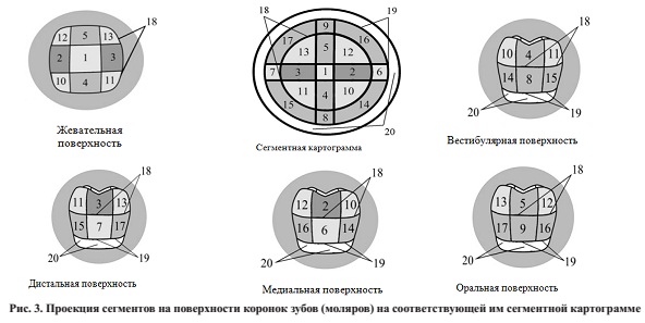 Отправным элементом данного метода послужило то, что поверхности коронок зубов с учетом их принадлежности к переднему или боковому отделам, а также количества корней, нами были поделены на 17 равных сегментов и обозначены известными для стоматологов терминами (рис. 1, 2, 3).