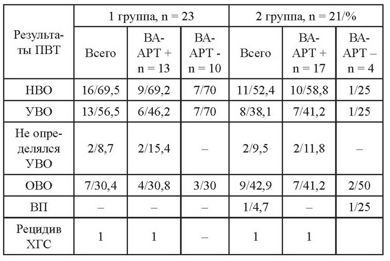 Результаты ПВТ ко-инфекцией ВИЧ/ВГС оценивались по общепринятым критериям и представлены в табл. 2. Не установлено достоверных различий в частоте и характере вирусологического ответа (ВО) на ПВТ как в целом в группах, так и в зависимости от получения ВААРТ.