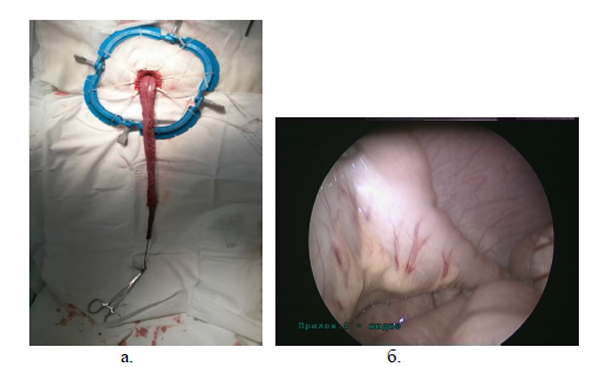 В I группе пациентов было произведено трансанальное эндоректальное низведение кишки (43 операции) (рисунок 6.а.), из них 4 случая - с лапароскопической мобилизацией толстой кишки (рисунок 6.б.) и 2 - с лапаротомией и мобилизацией кишки.